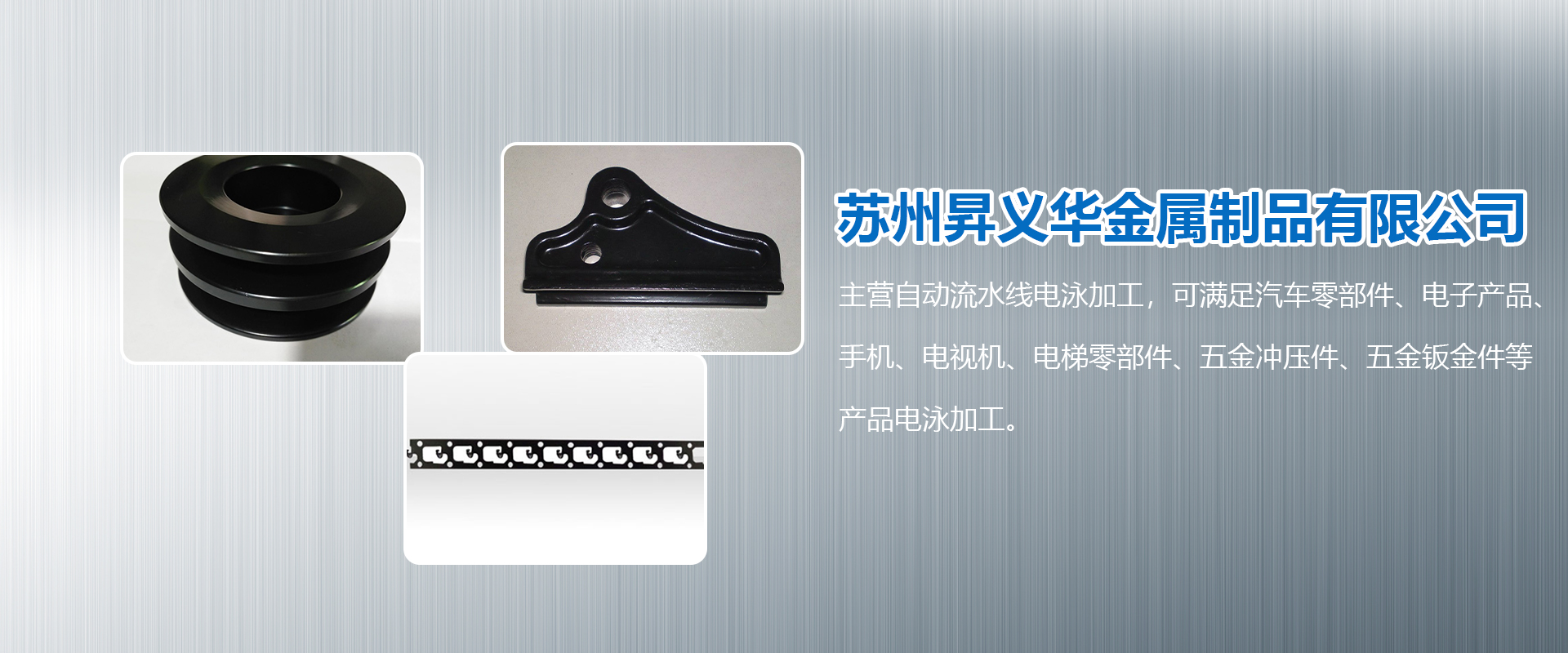 蘇州昇義華金屬制品有限公司是一家進行各類金屬表面處理專業公司。主營自動流水線電泳加工,可滿足汽車零部件、電子產品、手機、電視機、電梯零部件、五金沖壓件、五金鈑金件等產品電泳加工。